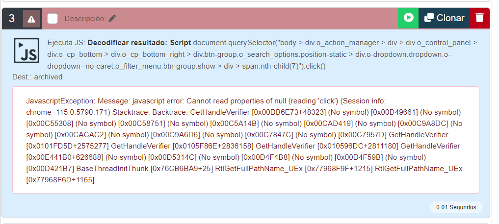 Hola estoy tratando de dar click a elemento web pero muestra el siguiente error. Al parecer solo si la ventana esta en primer plano lo ubica sino no. Alguien podria ayudarme por favor.