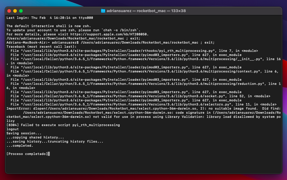 Esta seria la ultima pantalla que me aparece cuando ejecuto Rocketbot_mac posteriormente no me abre el navegador para dirigiese a localhost:5000. Tengo instalado X Code y utilizo la ultima versión de BigSur 11.2