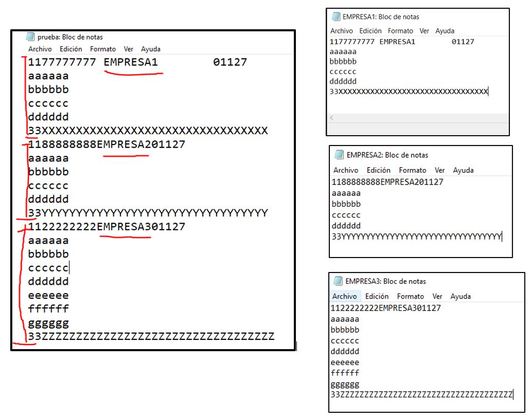 Buenas tardes, Tengo un archivo txt que se descarga todos los dias de una pagina web y se requiere separar el contenido en distintos archivos txt por empresa tal cual lo muestra la imagen adjunta.