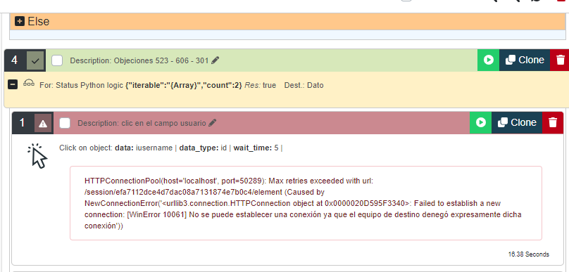 0 diego Asked: Febrero 22, 2024In: Ejecución Error de conexión al realizar varias ejecuciones del robot 0 Estoy realizando un robot el cual tiene como funcion ingresar a una pagina 6 veces con diferentes tipos de usuarios, al momento de cerrar sesión para ingresar con otro usuario se cierra el navegador y me presenta el error que ... conexión