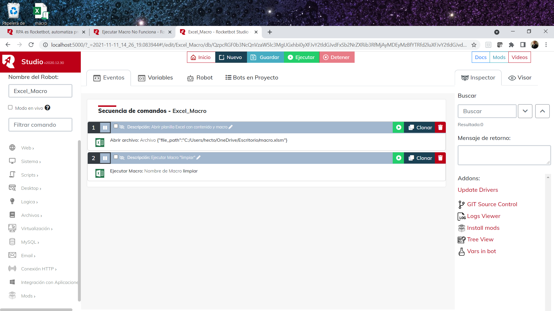 Sí, estoy trabajando con Windows 10 Home. Te adjunto dos capturas de pantalla. La plataforma no arroja ningún error, la instrucción de ejecutar la macro de Excel simplemente no se ejecuta. EL 1er paso es abrir el libro Excel, eso lo hace, pero el 2do paso, ejecutar la macro “limpiar”, no hace nada porque la hoja Excel no se limpia como lo muestra el video.