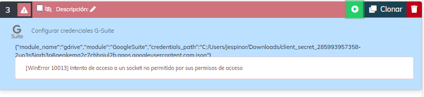 Buenas estimados. Tengo un error en el modulo Drive 2.4 al momento de configurar servidor me da “[WinError 10013] Intento de acceso a un socket no permitido por sus permisos de acceso“. Mensaje de consola: C:/Users/jespinor/Downloads/client_secret_285993957358-2uo3s5iqrb3p6aeqkema2c7chhniul2b.apps.googleusercontent.com.json EXCEPTION IN (<string>, L_113 “”): [WinError ...