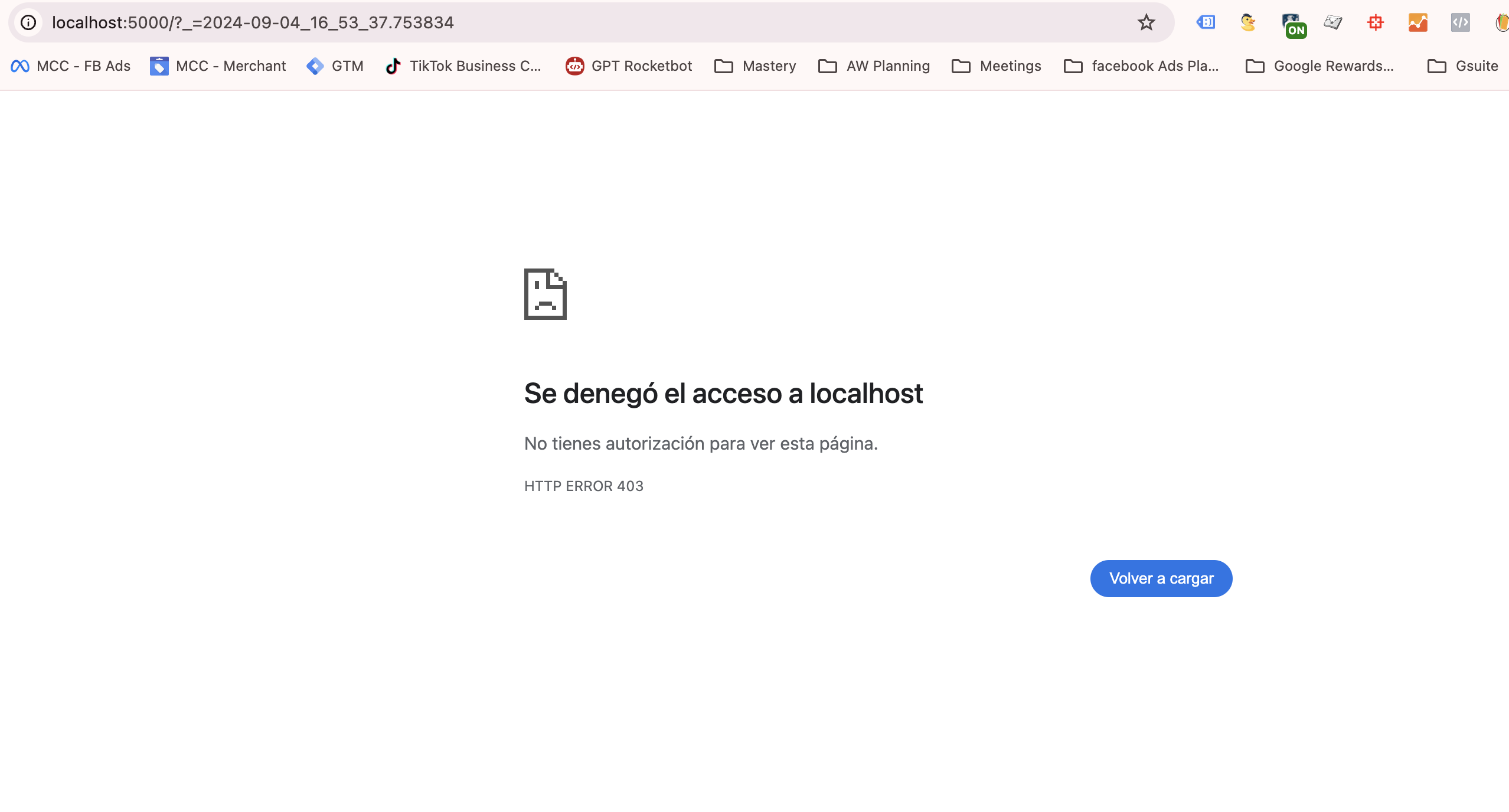 0 Nicolas Asked: Septiembre 4, 2024In: Ejecución Se denegó el acceso a localhost 0 Al ejecutar rocketbot desde mi mac, me arroja el error Se denegó el acceso a localhost No tienes autorización para ver esta página. HTTP ERROR 403 question