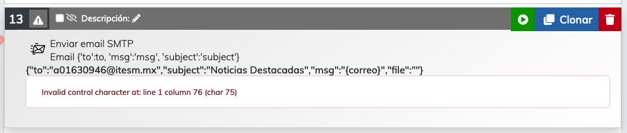 1 vansz1212 Asked: Enero 13, 2021In: Módulos Error al enviar correos 1 Trato de enviar por correo una variable que contiene saltos de línea “\n” y me marca error: Invalid control character at: line 1 column 76 (char 75) Intenté con el módulo de gmail y con el módulo de email normal y ... mail