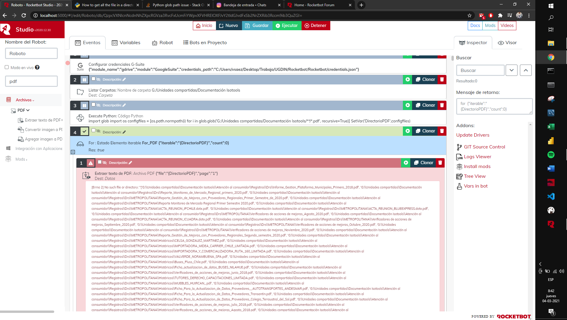 Hola, espero estén bien. Estoy tratando de sacar información desde unos PDF que están dentro de una carpeta, además de sus subdirectorios. Usando glob, pude identificar todos los archivos con esta extensión, pero al momento de usar el módulo PDF de Rocketbot, ...