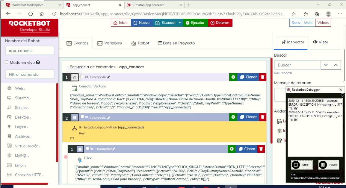 Sigo con este error. No ejecuta los robots generados con DesktopRecorder. Ya actualicé el módulo WindowsControl. Probé abrir un navegador y ese comando sí lo ejecuta, pero estos del Recoerder no. Adjunto una imagen con la forma en que muestra el error. Incluyo además el log que veo: """ 2020-12-14 1Read more