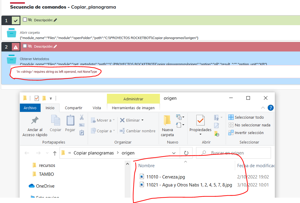Hola, Estoy usando la opción obtener metadatos del módulo Files, pero me está dando el error ‘in <string>’ requires string as left operand, not NoneType Esto son los parámetros que uso: