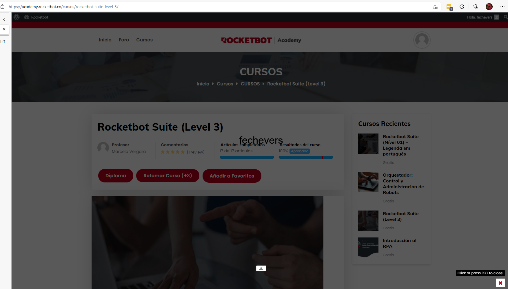 Hola, no me aparece el diploma de haber completado el curso 3. Probé con dos navegadores diferentes y lo mismo. Al hacer clic en descargar me sale el certificado en negro completo.