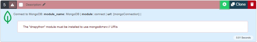 0 9321alexisv Asked: Mayo 29, 2024In: Comandos Conexión a MongoDB 0 Hola, Al tratar de conectarme a MongoDb con un cluster obtengo el error The “dnspython” module must be installed to use mongodb+srv:// URLs Que puedo hacer? conexióndnspythonmongodb