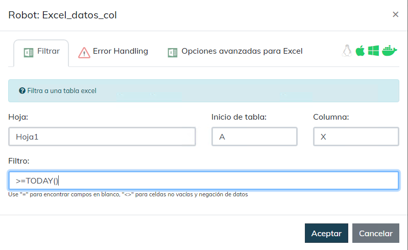 Buenos dias Me podrían ayudar con esto por favor Quiero filtrar todas las celdas de la columna X  en excel que sean iguales o superiores/posteriores a la fecha de hoy . Probe con el comando >=TODAY(), pero no funciono, tambien de ...
