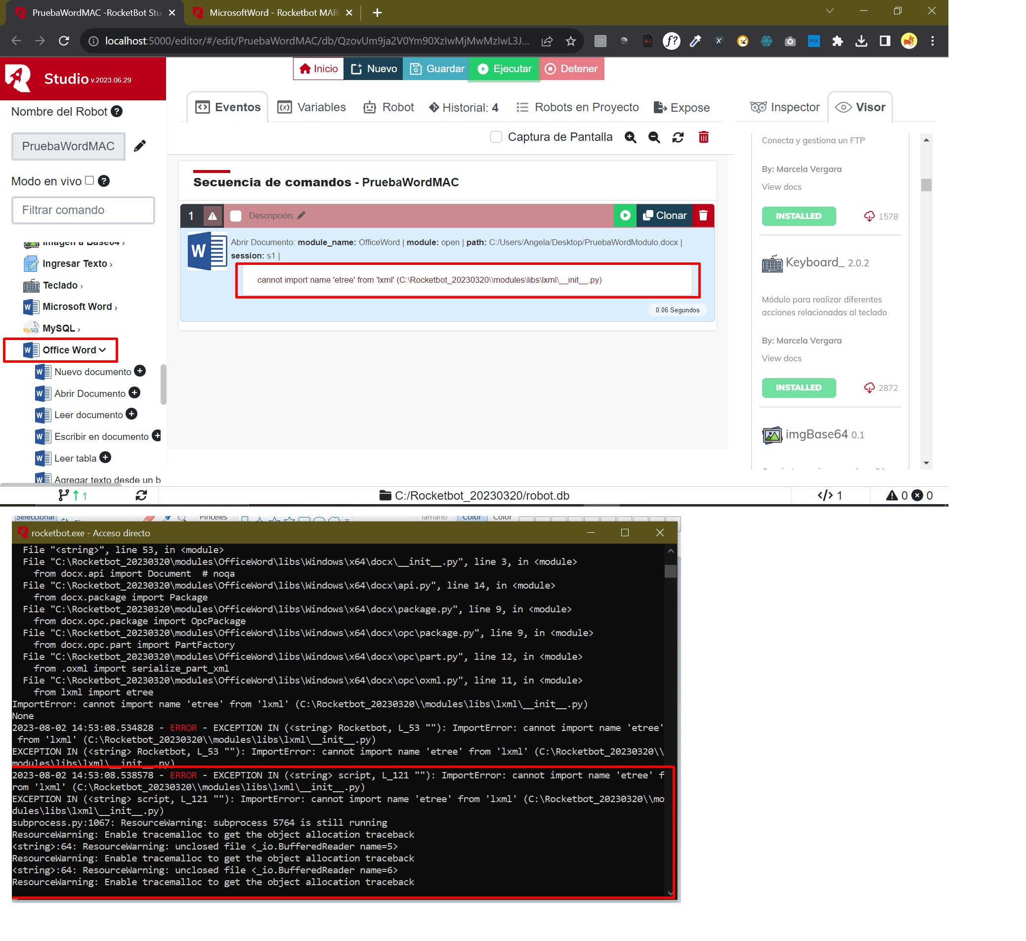 ¡Hola! a todos Alguien por favor me podría confirmar si este módulo: OfficeWord, ya no se utiliza en Rocketbot? Pregunto porque en desde la versión 2020, no me funcionaba (Windows), es decir, ni siquiera el comando para abrir un documento de ...