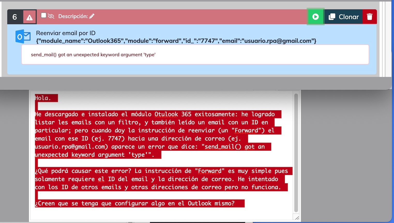 Muchachuser. Agradecería de vuestra ayuda para saber si alguien ha tenido problemas para realizar la conexión con los módulos OfficeOutlook y/o Outlook365. No estoy logrando realizar una conexión exitosa en ninguno de los 2 módulos, obteniendo False. Configuré la ...