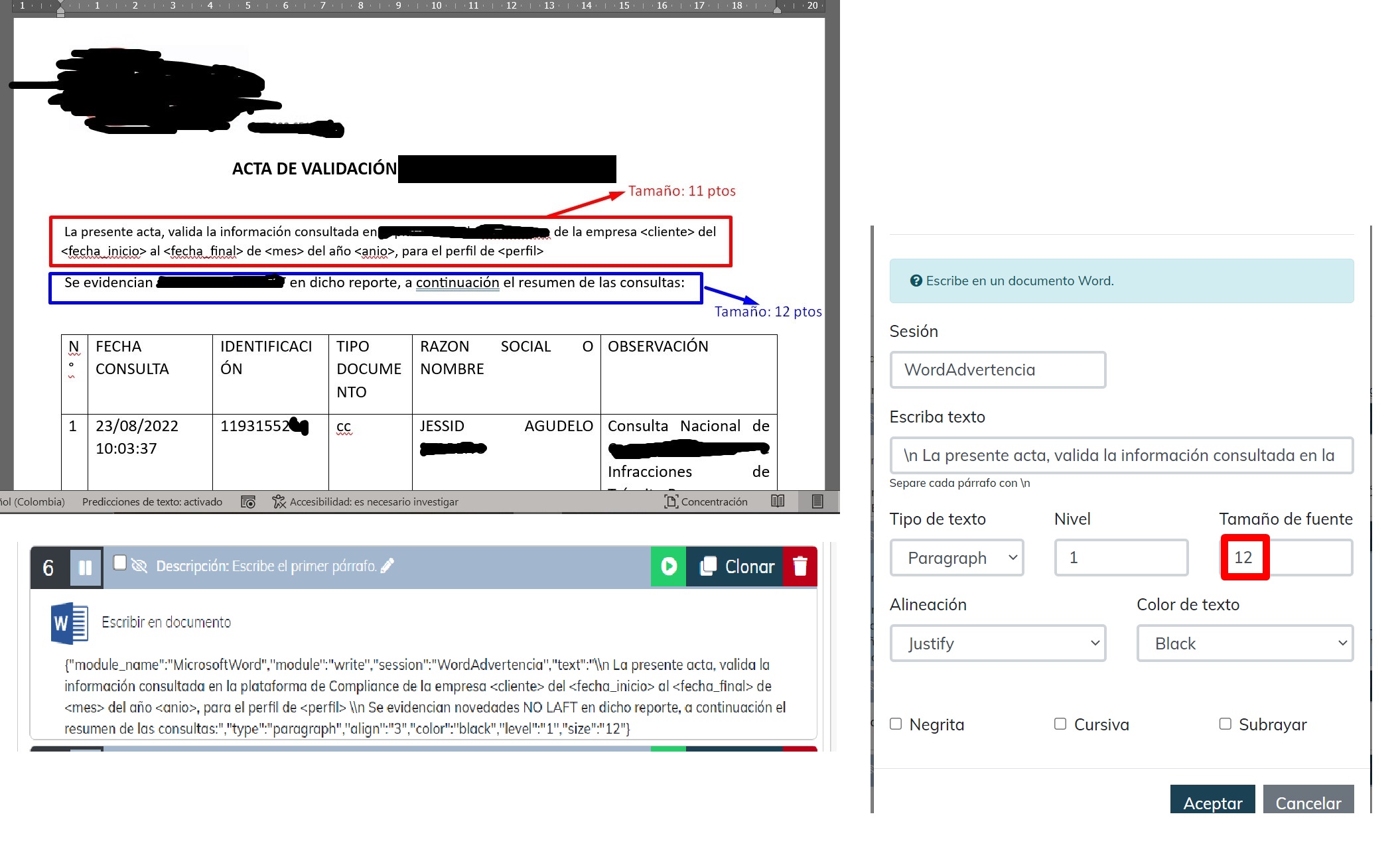 Hola! a todos. Alguien podría por favor ayudarme con lo siguiente: Programé un Robot que elabora un Acta en Word. (Módulo: Microsoft Word. Versión Rocketbot: 2020). Tengo actualizado el módulo Microsoft Word. Después que coloco el título del documento: “ACTA DE VALIDACIÓN…”, agrego ...