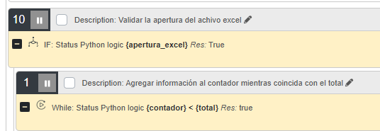 Estoy creando un bot donde extraigo información de una pagina y la inserto en un archivo excel, pero hago uso de dos comandos (IF) Y (WHILE), esto me genera un error al retornarme la información, solo me retorna en el ...