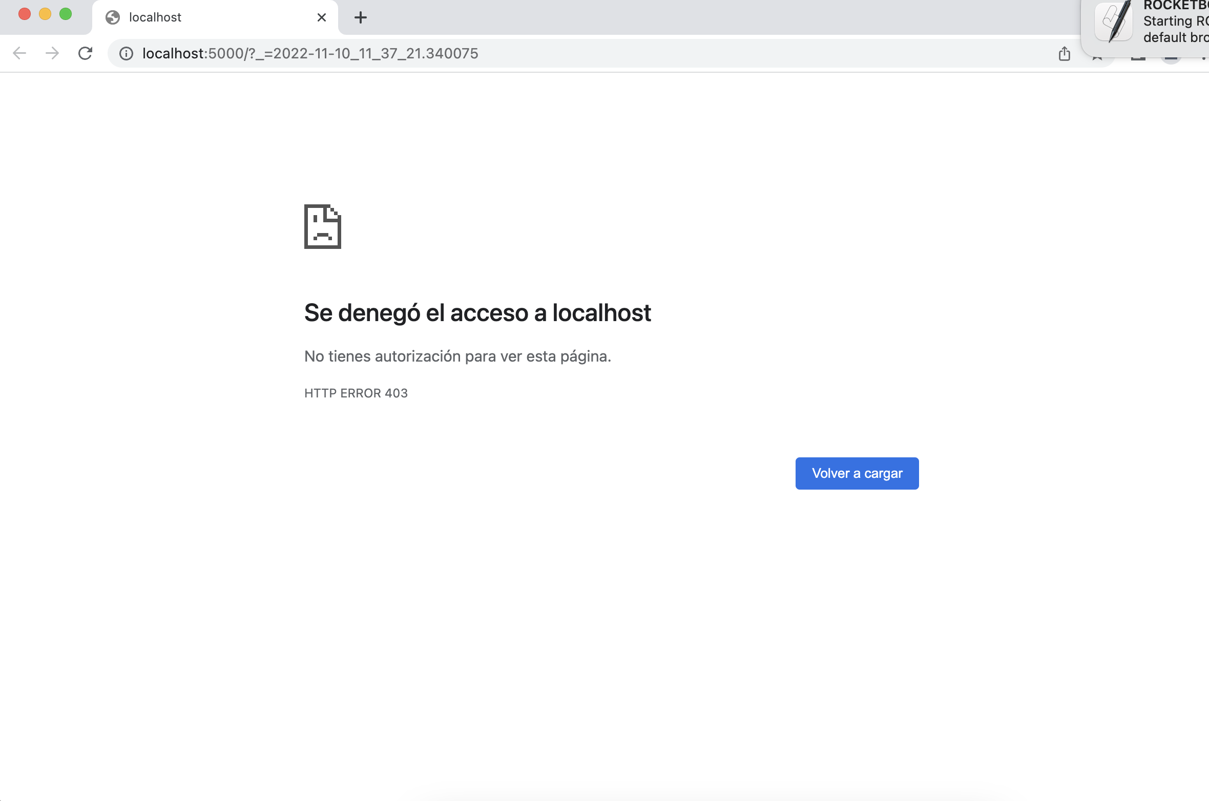 Es por el puerto 5000 a veces mac lo utiliza, debes cambiarlo en el archivo rocketbot.ini que está en la raíz de la carpeta Rocketbot, luego del cambio debes cerrar la consola y volverla a abrir, acá te explicamos los pasos a seguir: Link