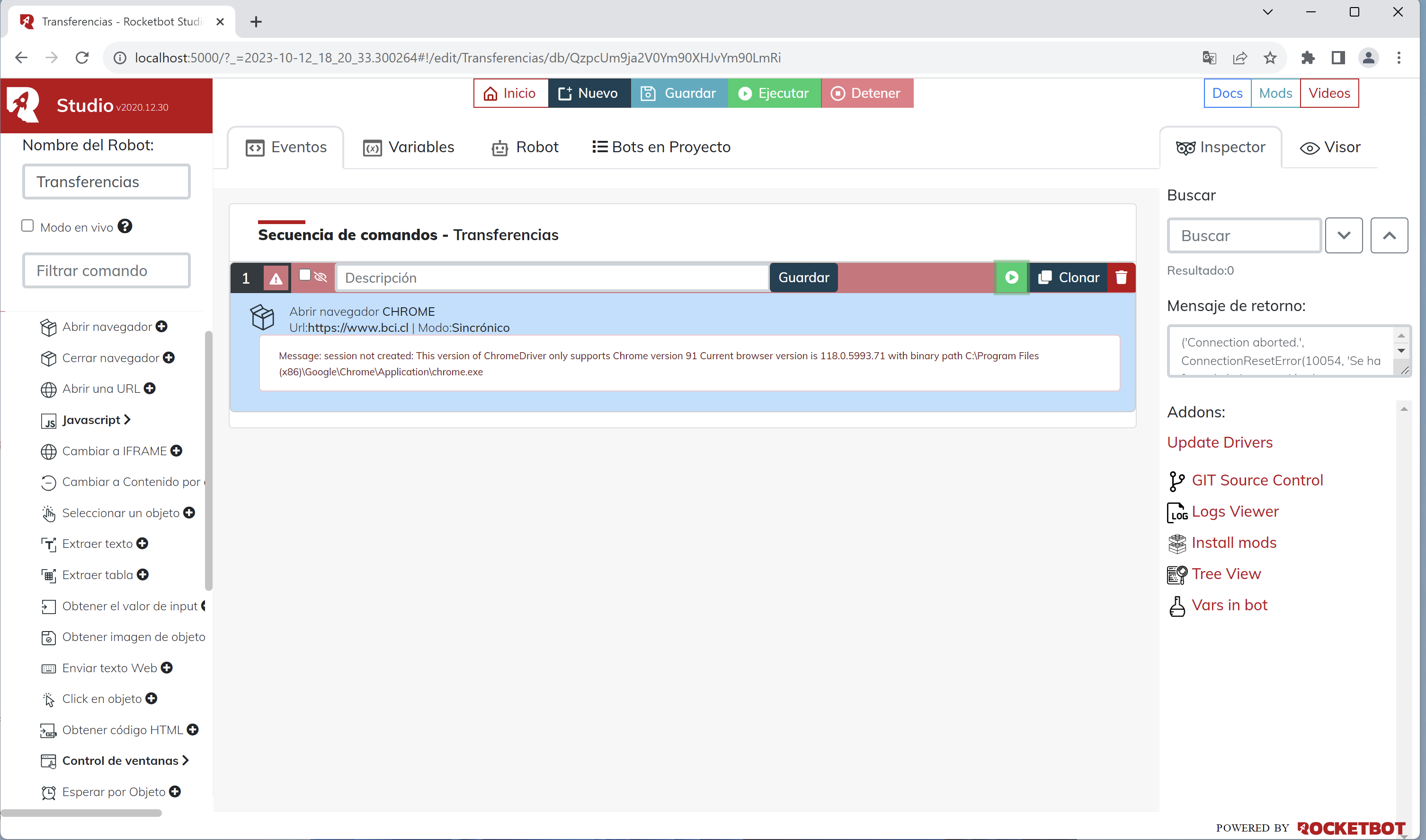 Hola, me esta saliendo error, ya se reinicio rocketbot una vez que se remplazo el drive y sigue marcando el mismo error