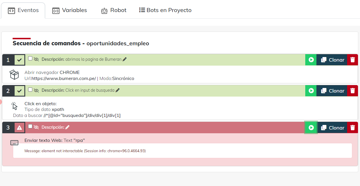 Hola, estoy iniciando este tema del RPA, y al hacer un Bot, abro una página web, hago click en la opción de búsqueda, sin embargo al intentar enviar texto web me aparece el mensaje de error siguiente: