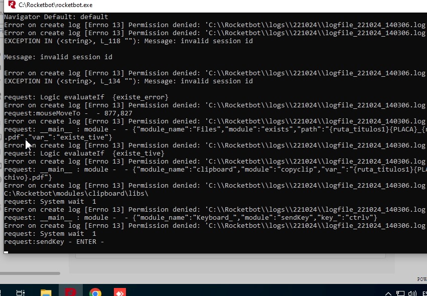 Al correr una base de 150 registros el robot presenta “Error al crear logs [Errno 13]”.Inmediatamente el robot se para y no se indica la causa ni figura el tipo de error final .Esto se repitió varias veces sin patrón aparente