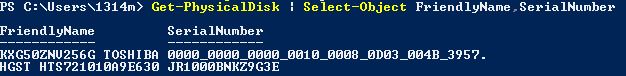 Get-PhysicalDisk | Select-Object FriendlyName,SerialNumber